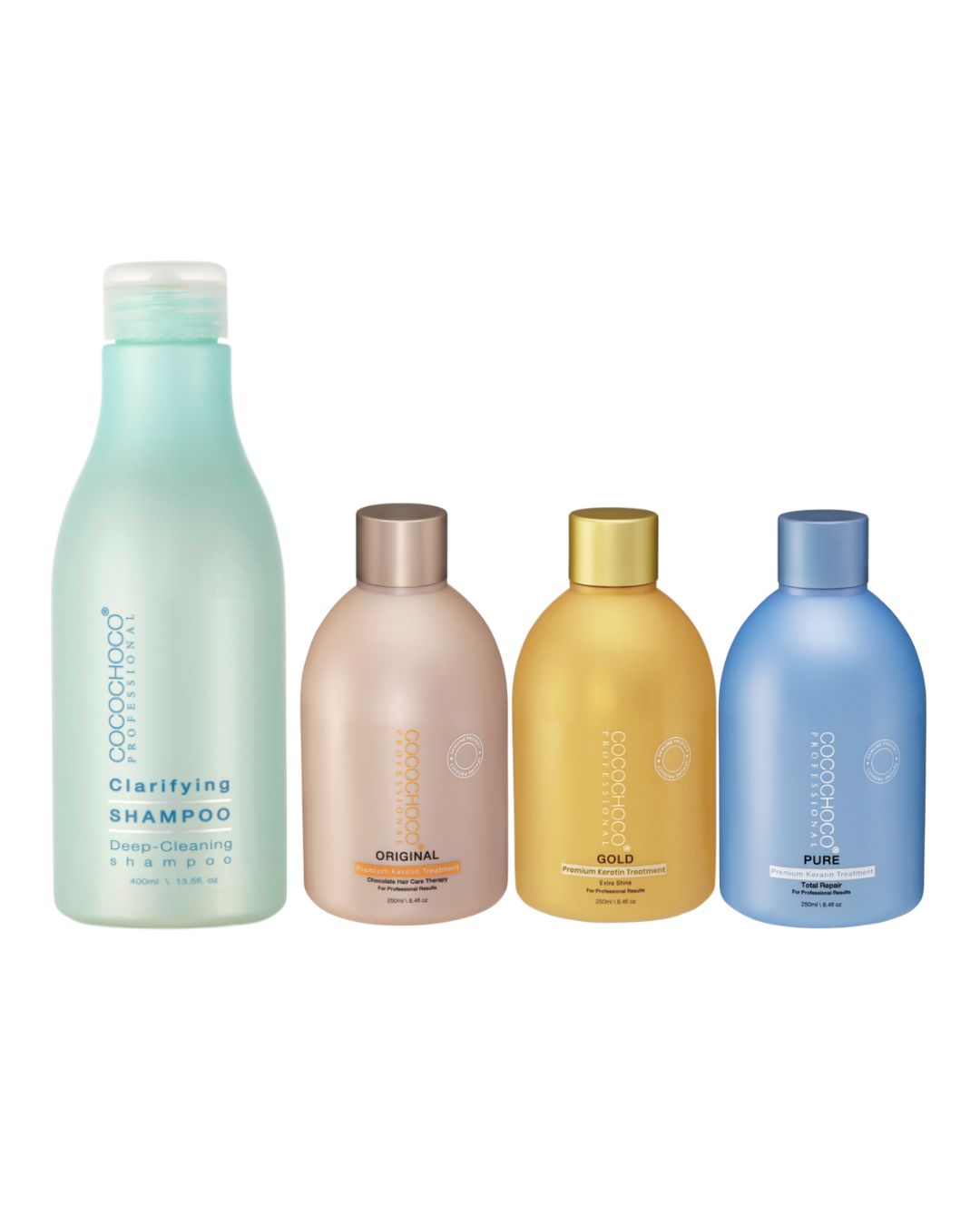 Kit no. 6 Includes: 1 Keratin Original 250ml, 1 Keratin Pure 250ml, 1 Keratin Gold 250ml, 1 Clarifying Shampoo 400ml